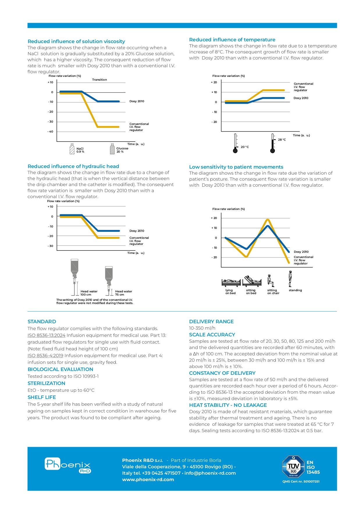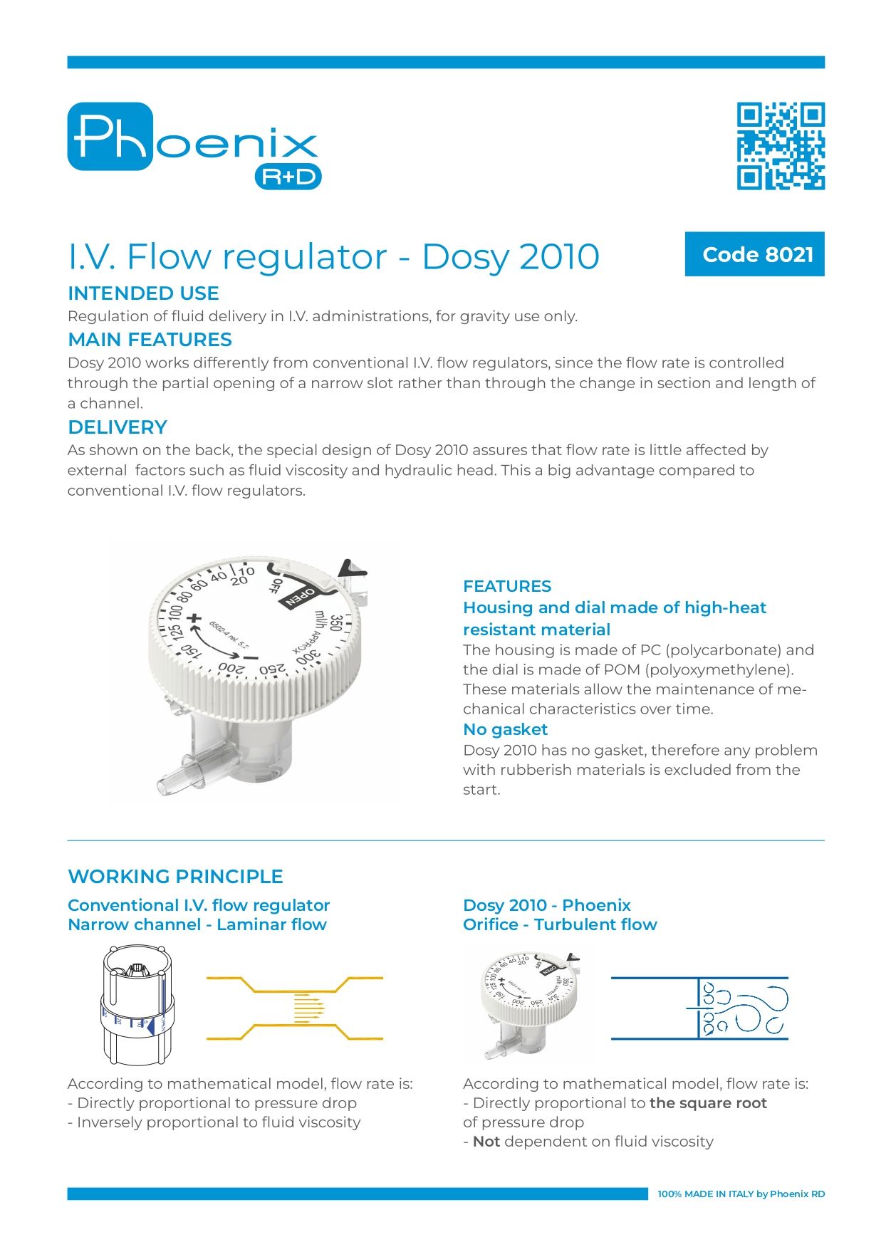 流量调节器 流量调节器Dosy 2010 代码 8021 Your browser does not support the video tag. 所有产品 预期用途在I.V.(静脉注射)中调节液体流量,仅在重力作用下使用 主要功能高性能的静脉输液流量调节器 外壳和刻度盘由耐高温材料制成 最高消毒温度 60°C保质期:5 年 紊流Dosy 2010 是一款与众不同的流量调节器。它是基于一个开口可变的孔口,而非普通的细通道。与传统的静脉输液流量调节器相比,它能产生更稳定的紊流并抵御外界干扰。 低标准差,高精度 所采用的处理方式和解决方案确保了交付的一致性非常高。 7 减少外部因素影响,如-溶液粘度-温度-液压头/压力 Dosy 2010 代码 8021数据表 所有产品